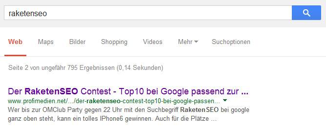 Wer am 10. September gegen 22 Uhr bei Google zu "raketenseo" oben steht, der gewinnt das Iphone 6 von sparhandy. Also: Raketen zünden und ins Weltall schießen! Wir, profimedien.net sind auch dabei!